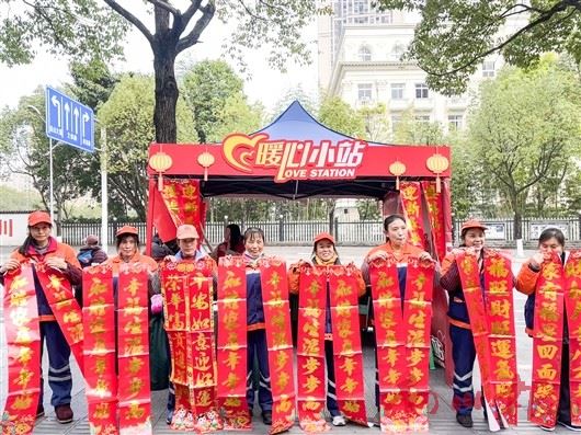 志愿者为一线工作者送上对联和暖冬物资。见习记者 张朴 摄隆冬时节,温暖同行。1月15日,南川区开展“冬日送温暖·爱满南川城”志愿服务活动,在传媒中心楼下设置“暖心小站”,为一线工作者送去冬日温暖。活动