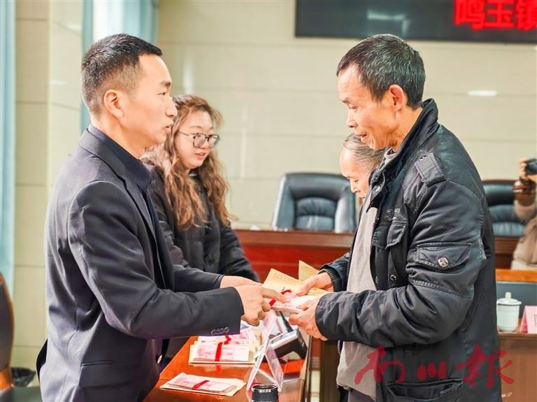 23623 次浏览 01-10水稻收购商将分红款交到村民手中。记者 王婷婷 摄“解德渊,5400元。”“严保均,6900元。”日前,南川鸣玉镇政府会议室内人头攒动、气氛热烈,十几位村民代表依次在明细表上签名,领走属于自己的那份优质