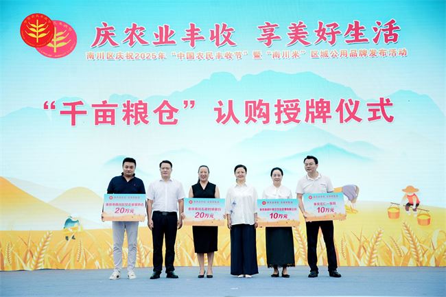 这次田间活动没有只图表面热闹,而是通过“南川米”品牌赋能,把品牌价值落实到农户增收上。开幕式上,“千亩粮仓”认购授牌仪式成了最受关注的环节。4家粮油企业代表依次上台,从南川区领导手中接过认购牌匾,“这次认购‘千亩粮仓’,就是要锁定优质货源,后续按保底价收购,你们种多少,我们收多少!”粮油企业代表的话音刚落,台下的农户们就鼓起了掌。